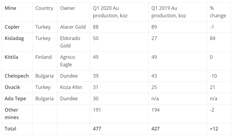 Proizvodnja zlata u Evropi (bez Rusije) porasla je za 12% i iznosila je 477 koz (tisuća unci) u prvom kvartalu 2020. Najveći proizvođač u Europi u ovom periodu je rudnik Copler (Çöpler) u Turskoj sa 88 koz u prvom kvartalu 2020-e. Industriju zlata u Evropi obično predstavljaju istaknutiji regioni za proizvodnju zlata, ali lokalni sektor zlata je također živahan. Rudnik zlata Eldorado Gold Kisladag (Kışladağ) bio je drugi po redu sa proizvedenih 50.176 unci, što je povećanje od 84% u odnosu na Q1 2019.